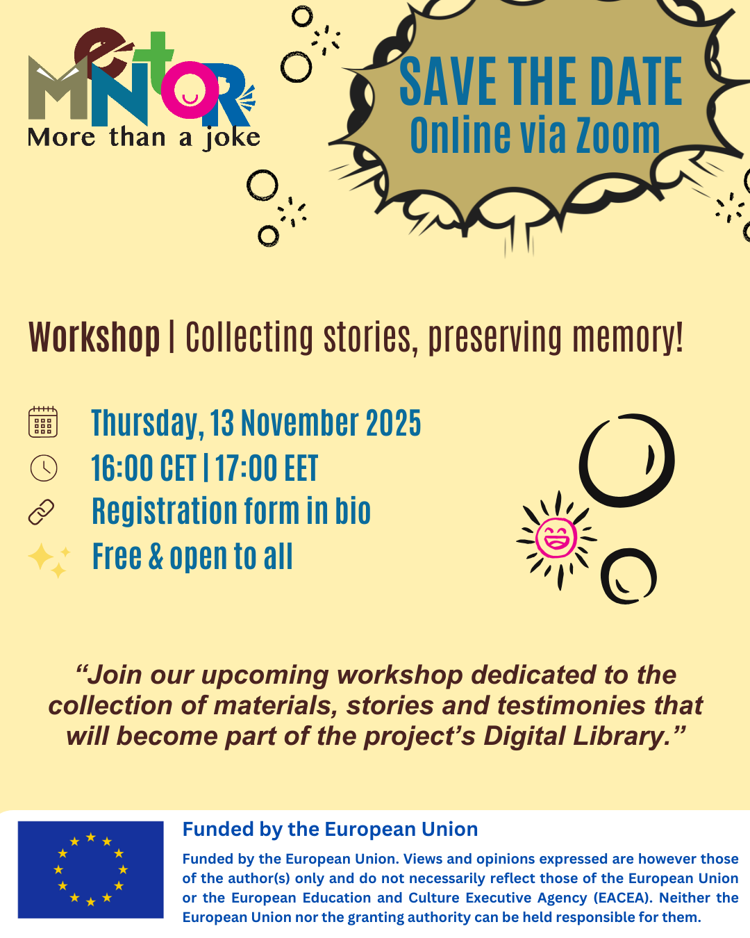 Next week MENTOR will host an interactive online workshop titled “Collecting Stories, Preserving Memory” on Thursday, 13 November 2025 (16:00–17:30 CET | 17:00–18:30 EET). The session invites participants to share materials, stories, and testimonies that will become part of the project’s Digital Library, preserving voices of resistance and humor across generations.